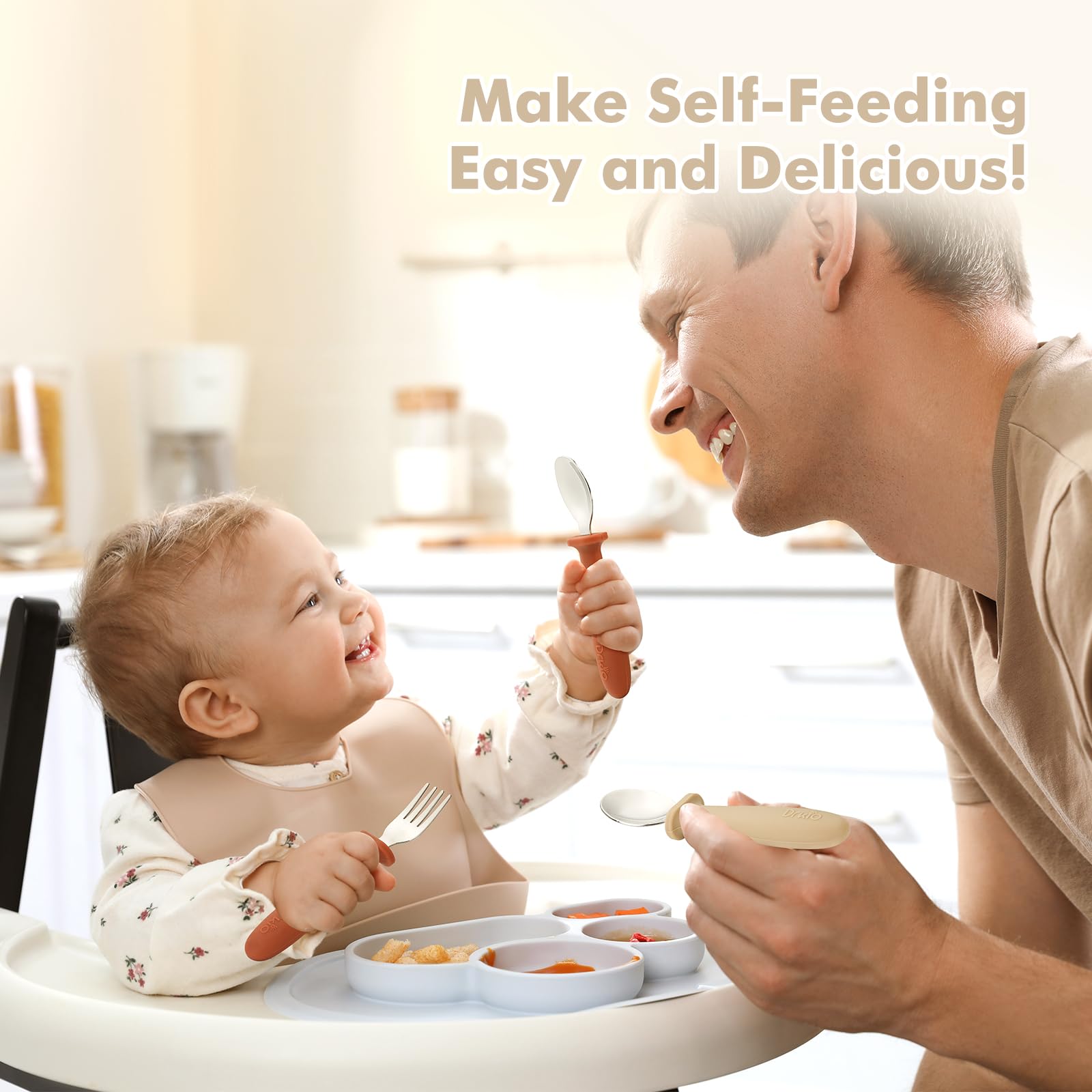 - BABY FOOD-GRADE MATERIAL: Crafted from 18/8 stainless steel and silicone, free from harmful chemicals like BPA, PVC and phthalates. Reliable quality ensures these utensils are dishwasher-safe for easy cleaning, saving time and effort while enjoyable meals