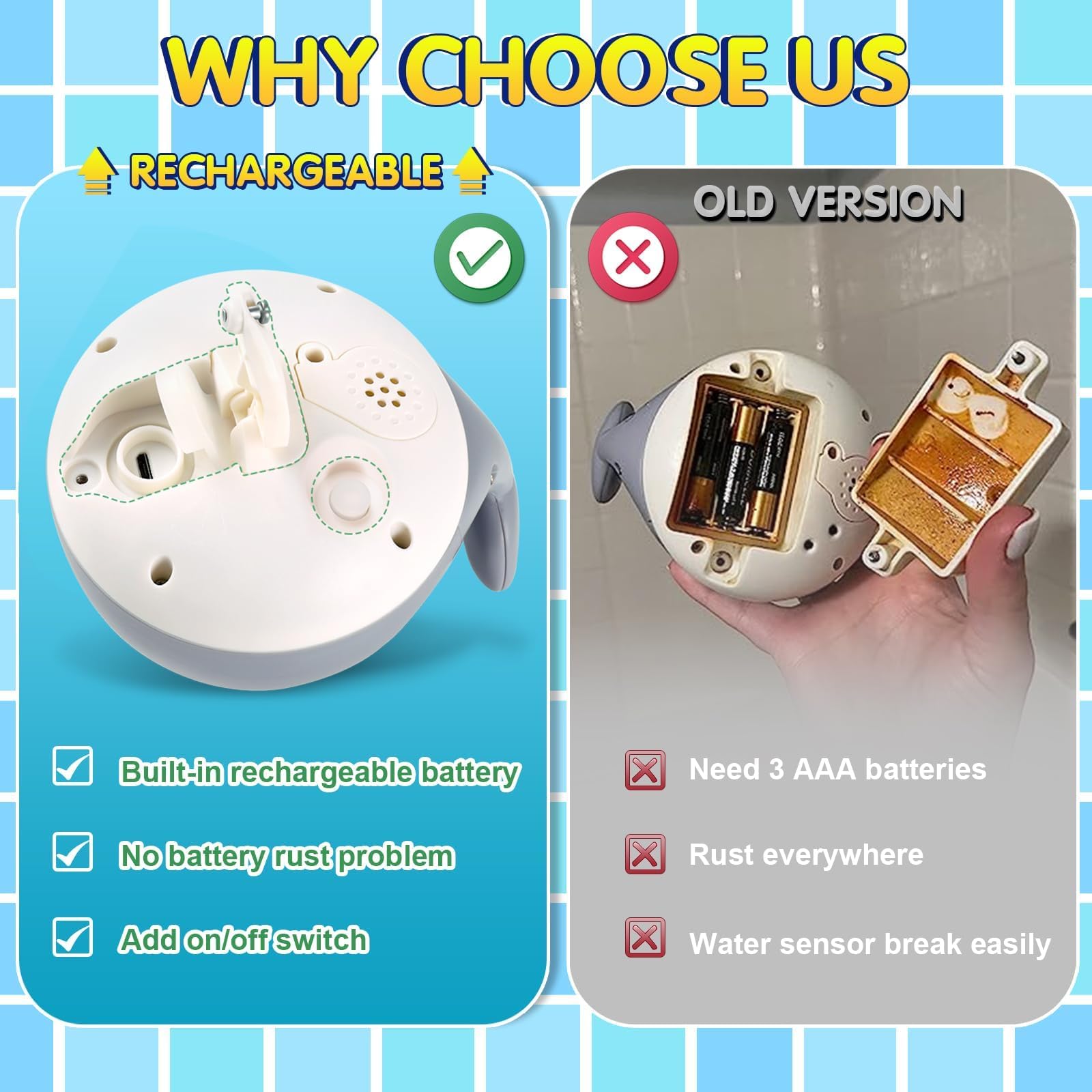 - Safe and Durable Use - no battery rust problems: We know that water leakage into the battery compartment is a significant problem of this cute whale bath toy. We design the built-in battery and use a silicone plug to protect the small USB charging port, preventing water seepage damage more effectively and protecting the baby's health. Our baby bath toys 12-18 months have longer service life than other brands. Have a try and Give your baby a cute interesting toddler pool toy