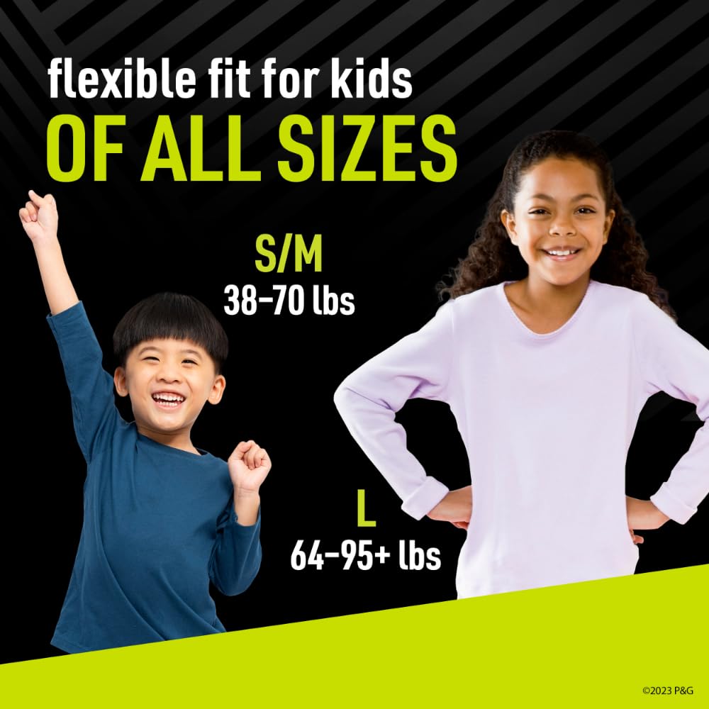 Details: Introducing Ninjamas Nighttime Underwear, the reliable solution for nighttime accidents and a good night's sleep! With our NEW AND IMPROVED design, our nighttime pull ups help you say goodbye to wet sheets from overnight leaks and hello to good mornings. Designed for both boys and girls, our overnight underwear combines comfort and protection so your child can wake up dry every morning. With up-to 100% leak protection for 12 hours, you and your child can finally enjoy the peaceful nights you deserve. Created with patented Pampers LockAway Channels, our innovative nighttime pull-ups absorb liquids 3x faster* than the leading brand, guaranteeing powerful all-night leak protection. The 360° FormFit Waistband ensures a snug, underwear-like fit that accommodates children of all sizes, making it easy for them to pull up and down independently. Plus, our OdorMask Technology discreetly neutralizes unpleasant smells from overnight accidents, so your child can wake up fresh and ready for the day. As a proud partner on your big kid's journey towards independence, we prioritize your child's health and comfort. Our disposable bedwetting underwear is free from harsh chemicals, including parabens and latex***, making them safe for even the most sensitive skin. We are committed to your satisfaction, offering a Money Back Guarantee**** to ensure you are completely happy with your purchase. Available in sizes S/M (38-70 lbs) and L (64-95+ lbs), Ninjamas cater to kids of all sizes and age and are the perfect choice for parents seeking reliable and effective bedwetting underwear for kids. Make bedtime better with Ninjamas Nighttime Underwear by Pampers, the #1 Pediatrician recommended brand! (*vs. Previous Product) (**Based on size S/M and L vs. leading nighttime underwear. 280ml across 2 loadings) (***No natural rubber) (****Visit ninjamas.co/en-us/money-back-guarantee for full terms)
