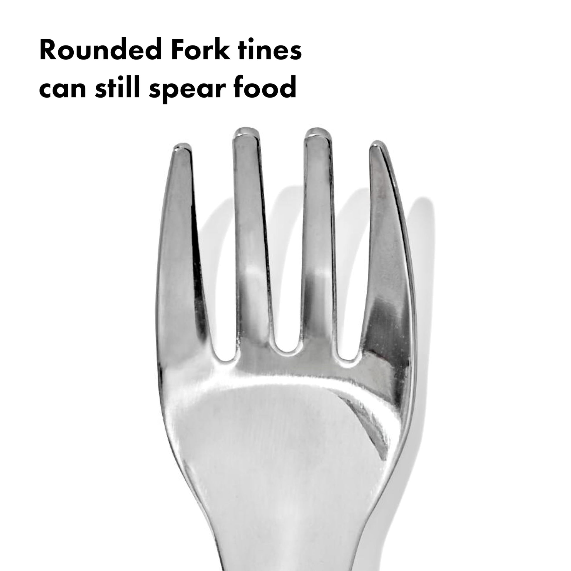 Details: The OXO Tot On-the-Go Fork & Spoon Set was designed for meals while out and about—whether that’s a picnic in the park, at school or just in the backyard. The stainless steel Fork tines are rounded (to protect little fingers) but can still spear food, and the matching Spoon is extra-deep for optimal scooping. The curved, non-slip handles are easy for learning hands to hold and feature a flat spot to keep the utensils from rolling away. Plus, the compact travel case can be easily tucked into lunchboxes, diaper bags, purses or pockets. Dishwasher safe.