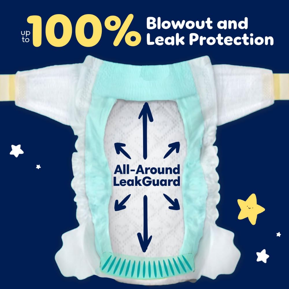 - The #1 Nighttime diaper* features a Blowout Barrier that helps prevent leaks up the back of the diaper for enhanced overnight protection and restful sleep. (*Based on US Nielsen data total number of diapers sold L52W, ending 7/27/24)