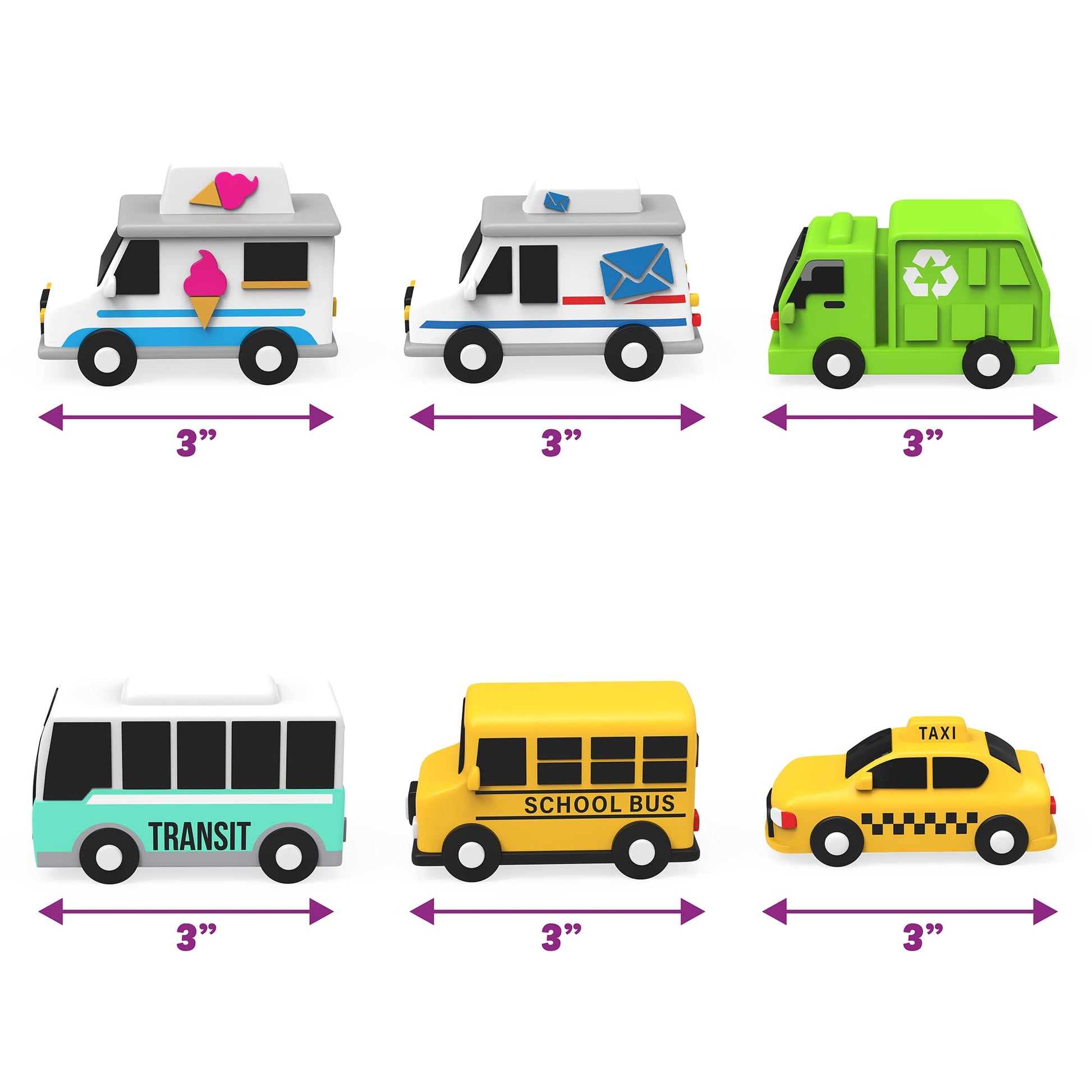 - CITY VEHICLES 6 PACK: Set includes (6) exclusive Mold Free Bath Toys featuring fun car bath toys - Mail Truck, School Bus, Ice Cream Truck, Taxi, City Bus & Garbage Truck - must-have toddler car toys!